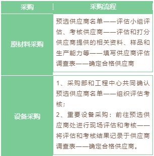 公司采購包括原材料采購和設備采購,采購流程主要有合格供應商選擇、框架合約簽署、供應商產(chǎn)品驗證和采購價格談判四個環(huán)節(jié)。