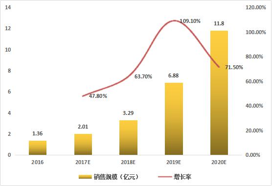 根據(jù)艾媒咨詢數(shù)據(jù)顯示,2016年中國智能音箱銷售規(guī)模為1.36億元,預(yù)計2017年將突破兩億,達到2.01億,增長率為47.8%;預(yù)計到2020年,智能音箱銷售規(guī)模將超過10億元。目前雖眾多廠商已推出智能音箱產(chǎn)品,但市場總體銷售規(guī)模仍處于較低水平,隨著產(chǎn)品進一步優(yōu)化升級及智能家居的推廣,中國智能音箱消費市場潛力將得到釋放,行業(yè)有望迎來爆發(fā)式增長。