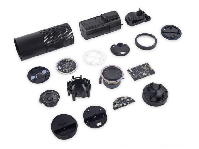下圖展示了 Echo 拆解后的部件。可以看到,智能音箱的硬件并不算復(fù)雜(相對于無人駕駛等“重型”AI 產(chǎn)品)。