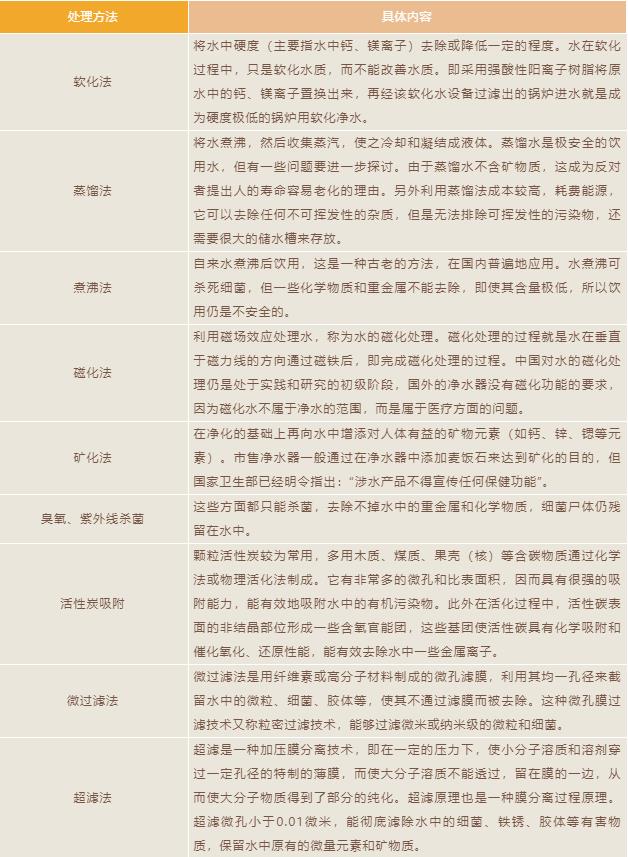 水質(zhì)處理方式有以下十類:軟化法、蒸餾法、煮沸法、磁化法、礦化法、臭氧紫外線殺菌、活性炭吸附、RO逆滲透膜、微過濾、超過濾。
