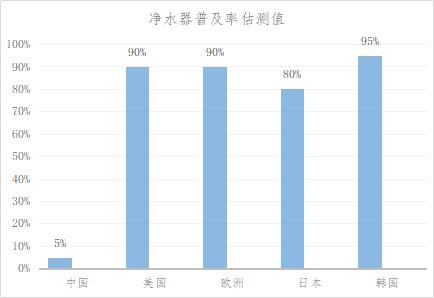 中國市場凈水器普及率相比歐美發(fā)達國家較低,凈水器普及率僅約占5%,同時市場總規(guī)模也較其他廚衛(wèi)電器較小。