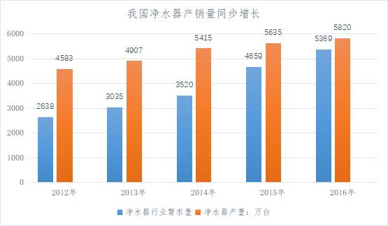 2012 年以來,我國凈水器的產(chǎn)銷量逐年增長,市場需求不斷擴大。2016 年,凈水器產(chǎn)量達到 1,347.8 萬臺,銷量為 1,353.4 萬臺。從 2014 年開始,凈水器產(chǎn)銷量增速雙雙放緩,市場進入調(diào)整期。相對于整個家電行業(yè)而言,凈水器市場仍然維持著較高增速,市場潛力較大,競爭激烈。