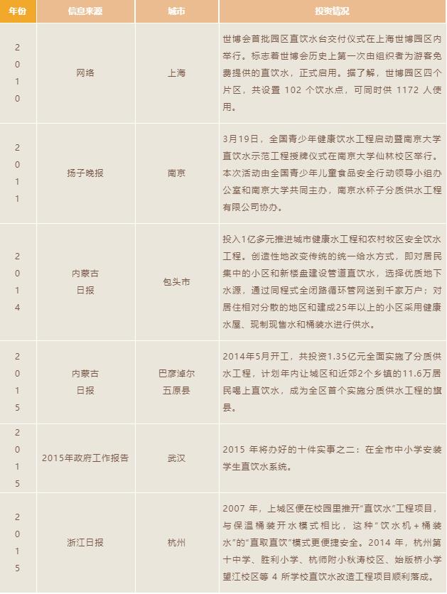 部分政府網(wǎng)站、媒體報道中各地區(qū)直飲水供水投資情況列表:
