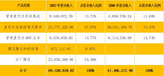 公司的主營業(yè)務為管道直飲水系統(tǒng)BOT業(yè)務、管道直飲水系統(tǒng)集成、直飲水設備的生產(chǎn)、銷售及服務,其收入按產(chǎn)品類別列示如下: