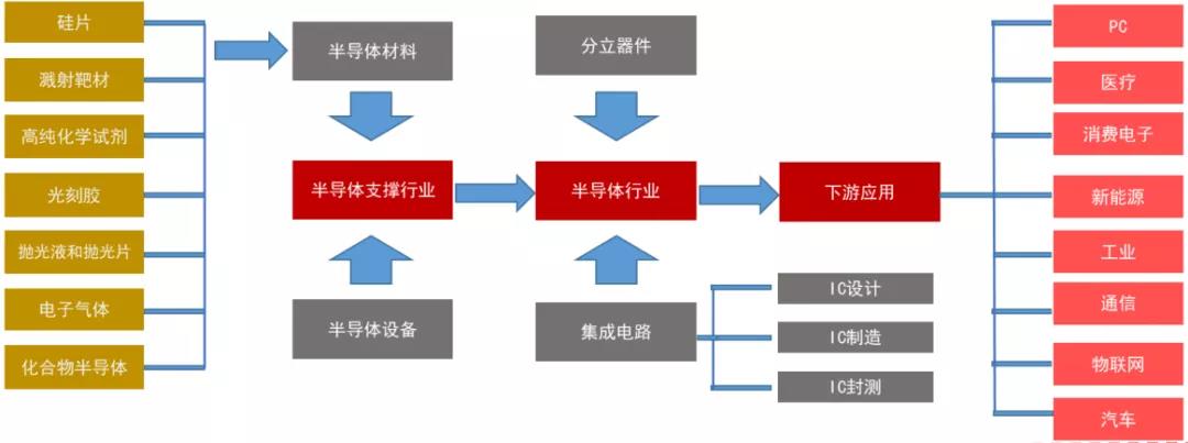 半導(dǎo)體行業(yè)具有技術(shù)難度高、投資規(guī)模大、產(chǎn)業(yè)鏈環(huán)節(jié)長(zhǎng)、產(chǎn)品種類多、更新迭代快、下游應(yīng)用廣泛的特點(diǎn),產(chǎn)業(yè)鏈呈垂直化分工格局。半導(dǎo)體制造產(chǎn)業(yè)鏈包含設(shè)計(jì)、制造和封裝測(cè)試環(huán)節(jié),半導(dǎo)體材料和設(shè)備屬于芯片制造、封測(cè)的支撐性行業(yè),位于產(chǎn)業(yè)鏈最上游。