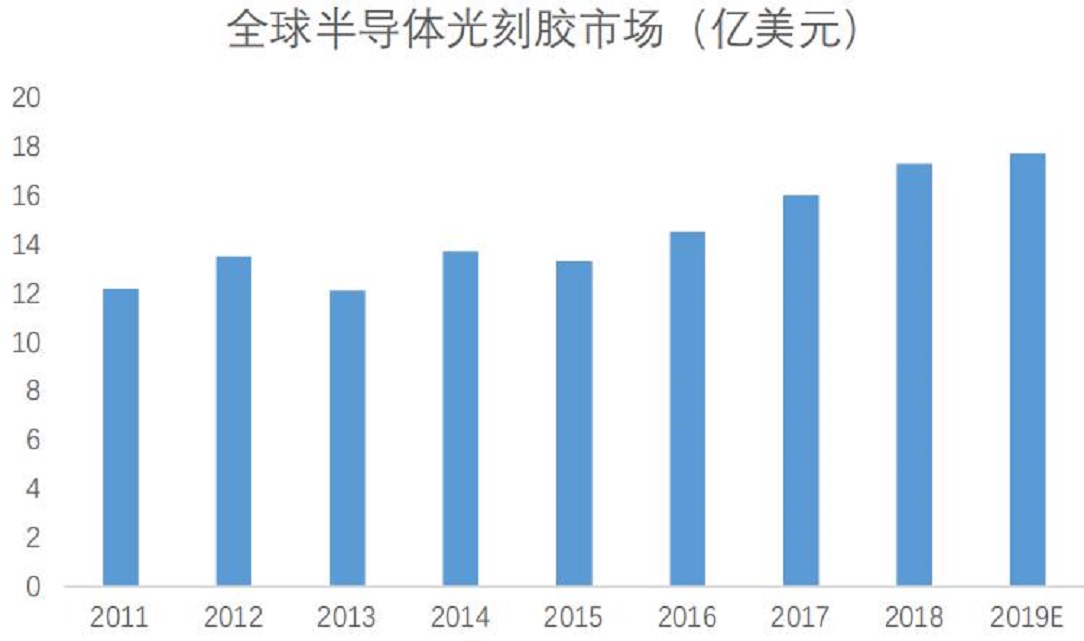 由于半導體光刻膠主要應(yīng)用于半導體制造,故半導體光刻膠市場與對應(yīng)晶圓廠產(chǎn)能密切相關(guān)。根據(jù)SEMI公布數(shù)據(jù),2018年全球半導體光刻膠市場共17.3億美元,同比增長2.3%。自2016年來,全球光刻膠市場年均復合增長率為9.23%。