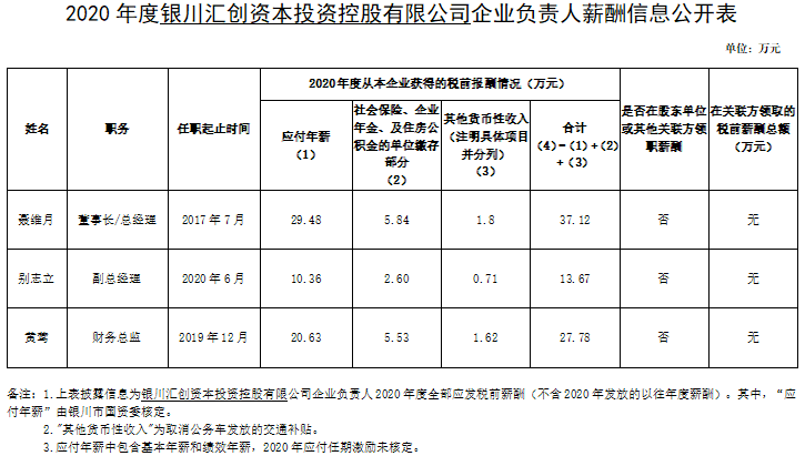 按照《銀川市屬國有企業(yè)負(fù)責(zé)人薪酬管理辦法(試行)》(銀國資發(fā)〔2021〕458號)規(guī)定,經(jīng)銀川市國資委核定,現(xiàn)將銀川匯創(chuàng)資本投資控股有限公司企業(yè)負(fù)責(zé)人2020年度薪酬信息予以披露。